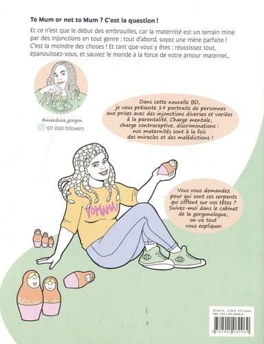 To Mum or not to Mum ? C'est la question ! Et ce n'est que le début des embrouilles, car la maternité est un terrain miné par des injonctions en tout genre : tout d'abord, soyez une mère parfaite ! C'est la moindre des choses ! Et tant que vous y êtes : réussissez tout, épanouissez-vous, et sauvez le monde à la force de votre amour maternel... Dans cette nouvelle BD, Noémie Fachan, créatrice du personnage de Maedusa, vous présente 19 portraits de Gorgones aux prises avec des injonctions diverses et variées à la parentalité. Devenir maman mais pas que, travailler mais pas trop, allaiter mais pas partout, tout gérer et plus encore... Charge mentale, charge contraceptive, discriminations : nos maternités sont à la fois des miracles et des malédictions ! Découvrez les récits de personnages qui se succèdent dans le cabinet de la gorgonologue pour confier leurs déboires face aux injonctions parentales.