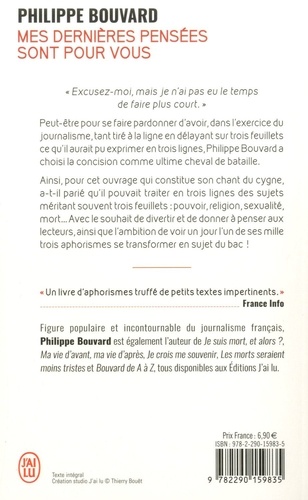 Peut-être pour se faire pardonner d'avoir,dans l'exercice du journalisme, tant tiré à la ligne en délayant sur trois feuillets ce qu'il aurait pu exprimer en trois lignes, Philippe Bouvard a choisi la concision comme ultime cheval de bataille. Ainsi, pour cet ouvrage qui constitue son chant du cygne, a-t-il parié qu'il pouvait traiter en trois lignes des sujets méritant souvent trois feuillets : pouvoir, religion, sexualité, mort... Avec le souhait de divertir et de donner à penser aux lecteurs,ainsi que l'ambition de voir un jour l'un de ses mille trois aphorismes se transformer en sujet du bac !