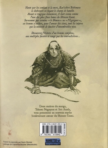 Hanté par les combats et la mort, Kan'ichirô Yoshimura se déshonore en fuyant le champ de bataille. Avant ce tragique événement, il était connu comme l'une des plus fines lames du Shinsen Gumi. Surnommé par certains "le Démon" ou "l'Egorgeur" , cet homme a enduré, pour l'amour des siens, tant les injures que la nécessité de faucher d'innombrables vies. Découvrez l'histoire d'un homme complexe, aux multiples facettes et rongé par les contradictions... Deux maîtres du manga, Takumi Nagayasu et Jirô Asada, vous présentent un nouveau mythe bouleversant autour du Shinsen Gumi.
