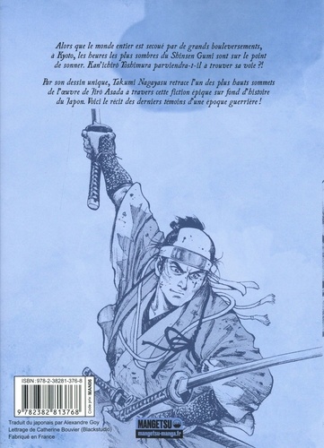 Alors que le monde entier est secoué par de grands bouleversements, à Kyoto, les heures les plus sombres du Shinsen Gumi sont sur le point de sonner. Kan'ichirô Yoshimura parviendra-t-il a trouver sa voie ? ! Par son dessin unique, Takumi Nagayasu retrace l'un des plus hauts sommets de l'oeuvre de Jirô Asada a travers cette fiction épique sur fond d'histoire du Japon. Voici le récit des derniers témoins d'une époque guerrière !