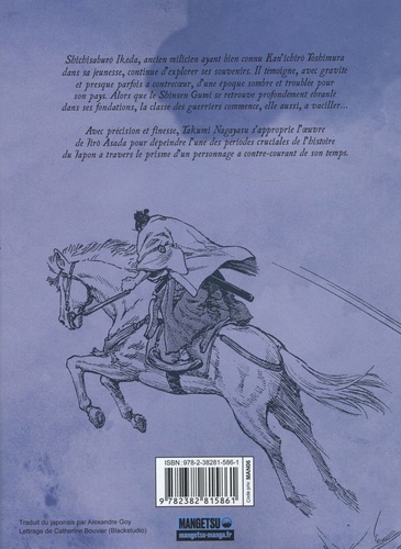 Shichisaburô Ikeda, ancien milicien ayant bien connu Kan'ichirô Yoshimura dans sa jeunesse, continue d'explorer ses souvenirs. Il témoigne, avec gravité et presque parfois à contrecoeur, d'une époque sombre et troublée pour son pays. Alors que le Shinsen Gumi se retrouve profondément ébranlé dans ses fondations, la classe des guerriers commence, elle aussi, à vaciller... Avec précision et finesse, Takumi Nagayasu s'approprie l'oeuvre de Jirô Asada pour dépeindre l'une des périodes cruciales de l'histoire du Japon à travers le prisme d'un personnage à contre-courant de son temps. Deux maîtres du manga, Takumi Nagayasu et Jirô Asada, vous présentent un nouveau mythe bouleversant autour du Shinsen Gumi.