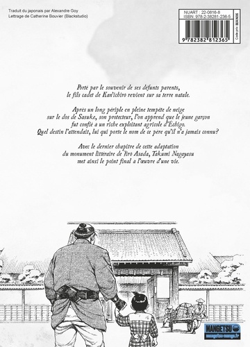Yoshimura est enfin de retour dans sa ville natale, accompagné des âmes de ses défunts parents et de sa famille. Son fils, "Kan'ichirô" , est alors confié à une famille de riches paysans d'Echigo après avoir été porté à travers la neige glacée par Sasuke le serviteur. Quel a été le destin du petit dernier, baptisé du nom de ce père qu'il n'a pas connu ? Takumi Nagayasu défie, en solitaire, l'un des plus hauts sommets de l'oeuvre de Jirô Asada pour nous offrir une conclusion inoubliable.