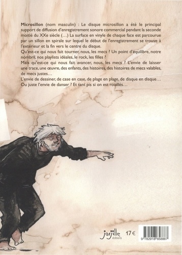 Microsillon : (nom masculin) : Le disque microsillon a été le principal support de diffusion denregistrement sonore commercial pendant la seconde moitié du XXe siècle (...) La surface en vinyle de chaque face est parcourue par un sillon en spirale sur lequel le début de l'enregistrement se trouve à l'extérieur et la fin vers le centre du disque. Quest-ce qui nous fait tourner, nous, les mecs ? Un point déquilibre, notre nombril, nos playlists idéales, le rock, les filles ? Mais quest-ce qui nous fait avancer, nous, les mecs ? Lenvie de laisser une trace, une oeuvre, des enfants, des histoires, des histoires de mecs valables, de mecs justes... Lenvie de dessiner, de case en case, de plage en plage, de disque en disque... Ou juste lenvie de danser ? Et tant pis si on est rouillés...