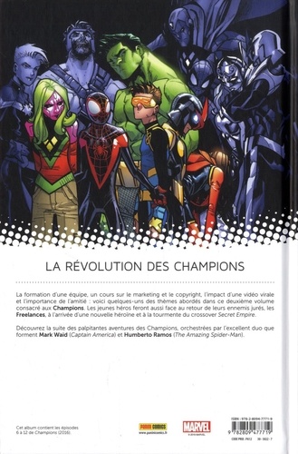 Suite et fin de cette période pour la série Champions qui réunit des personnages de plus en plus populaires. Les Champions, l'équipe créée par Miss Marvel, Nova et Miles Morales, doivent faire face à des problèmes familiaux, aux Freelancers et surtout, à un pays bouleversé par les événements de Secret Empire.