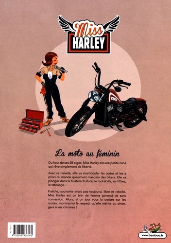 « Je n'ai besoin de personne en Harley-Davidson… » ; chantait Bardot avec les mots de Gainsbourg. Miss Harley a fait de ces paroles sa devise. Car du haut de ses 28 piges, Miss harley est une petite nana qui rêve simplement de liberté. Avec sa naïveté elle va découvrir, chambouler les codes et les a priori du monde quasiment masculin des bikers. Elle va plonger dans la Kustom Kulture, le rockabilly, les fifties, le tatouage. Fraîche, souriante (mais pas toujours), libre et rebelle, Miss Harley est un brin de femme pimenté et sans concession. Qui sait, peut-être un jour la croiserez-vous sur la route ?