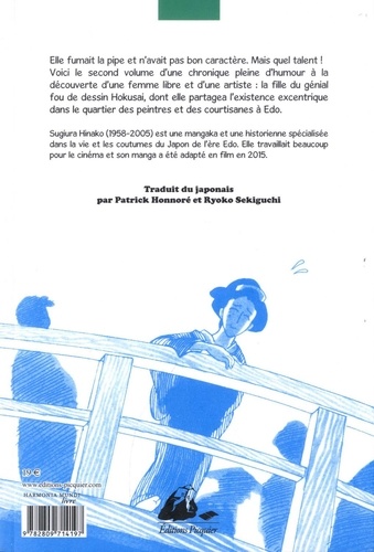 Elle fumait la pipe et n'avait pas bon caractère. Mais quel talent ! Voici le second volume d'une chronique pleine d'humour à la découverte d'une femme libre et d'une artiste : la fille du génial fou de dessin Hokusai, dont elle partagea l'existence excentrique dans le quartier des peintres et des courtisanes à Edo.