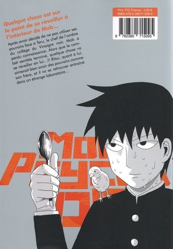 La nouvelle série de ONE, l'auteur de ONE-PUNCH MAN ! Préparez-vous au choc psychique !! Quelque chose est sur le point de se réveiller à l'intérieur de Mob... Après avoir décidé de ne pas utiliser ses pouvoirs face à Teru, le chef de l'ombre du collège du Vinaigre noir, Mob a perdu connaissance. Alors que le combat semble terminé, quelque chose va se réveiller en lui... !! Ritsu, quant à lui, aimerait bien avoir des pouvoirs comme son frère, et va se retrouver entraîné dans un étrange laboratoire...