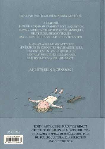 CE ROMAN GRAPHIQUE, SIGNE EDITH, EST NE D'UNE IDEE FASCINANTE : LA REVELATION DE SA VIE ANTERIEURE. Edith ignore si elle croit en la réincarnation... A vrai dire, elle ne s'est jamais vraiment posé la question. Comme pour d'autres perspectives mystiques, religieuses, philosophiques, par curiosité, elle laisse la porte entrouverte. Alors, quand une magnétiseuse lui a proposé de connaître sa vie antérieure, la conteuse en images qu'elle est a exprimé un intérêt certain pour une révélation aussi intrigante... C'est ainsi qu'elle a appris, dans cet ordre, que cette vie se passait en Suède, au XVIIIe siècle, qu'elle était un homme, pêcheur, qui aimait les femmes et qui était décédé de mort violente, assassiné... sans doute par un mari jaloux ! ... Edith, a-t-elle été Edin Björnsson ?