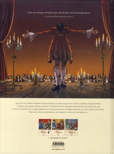 Agé de 40 ans, Molière s'apprête à épouser Armande, la petite soeur de son ancienne maîtresse, Madeleine Béjart. C'est dans ce contexte sulfureux qu'il écrit L''Ecole des femmes, ridiculisant avec férocité la domination du sexe dit fort et l'institution du mariage. Rapidement les attaques pleuvent et l'Eglise demande ou roi que la pièce sort interdite. Mais. pour certains ecclésiastiques, c'est l'auteur lui-même qu'il faut bâillonner...