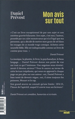 La musique, la planète, le livre, la psychanalyse, le beau langage... : Daniel Prévost donne son point de vue sur tout ce qui l'intéresse. Une angoisse nous étreint : serait-il devenu sérieux ? Vous le saurez au terme de cette lecture trépidante, qui nous en apprend à chaque page un peu plus sur son auteur : oui, Daniel Prévost a bien tenté de devenir végan ; oui, il aime toujours les poissons, Mozart et le rap. Son grand oeuvre ne connaît qu'une limite : 18 h 15, l'heure de l'apéritif, auquel il convie tous ses lecteurs !