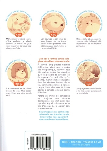 Une ode à l'amitié canine et la place des chiens dans notre vie. A travers cinq petites histoires différentes, dont une première très biographique, l'autrice nous fait revivre toutes les émotions qu'il est possible de traverser lors de la perte d'un chien qu'on a aimé. Comment l'accompagner dans les derniers instants de sa vie, comment continuer à honorer ce que l'on a vécu avec lui, à quel point il a compté et nous a permis d'évoluer... Perdre un animal de compagnie est toujours une épreuve douloureuse, qui doit aussi nous rappeler à quel point nous avons été chanceux de le croiser dans notre existence. En partageant ces sentiments universels, ces tranches de vie émouvantes nous apportent une consolation bienveillante.
