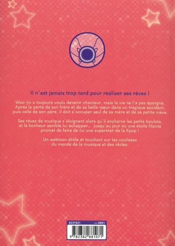 Il n'est jamais trop tard pour réaliser ses rêves ! Woo-jin a toujours voulu devenir chanteur, mais la vie ne l'a pas épargné. Après la perte de son frère et de sa belle-soeur dans un tragique accident, puis celle de son père, il doit s'occuper seul de sa mère et de sa petite nièce. Ses rêves de musique s'éloignent alors qu'il enchaine les petits boulots, et le bonheur semble lui échapper... jusqu'au jour où une étoile filante promet de faire de lui une superstar de la Kpop ! Un webtoon drôle et touchant sur les coulisses du monde de la musique et des idoles.