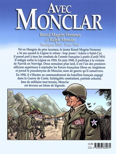 Au moment de sa disparition en 1964, tout le monde connaissait le général Monclar. Né à Budapest de père inconnu, le jeune Raoul Magrin-Vernerey a 16 ans quand la Légion le refuse : trop jeune ! Admis à Saint-Cyr, il prend part à tous les combats de l'armée française à partir d'août 1914. C'est un officier multi-blessé, multi-décoré qui intègre enfin la Légion en 1924. En juin 1940, il participe à la victoire de Narvik en Norvège. Deux semaines plus tard, il est l'un des premiers officiers supérieurs à rejoindre les Forces françaises libres en Angleterre. A partir de ce moment, il prend le pseudonyme de Monclar, nom de guerre qu'il conservera. En 1950, le général s'illustre au commandement du bataillon français engagé dans la Guerre de Corée. Infatigable combattant, patriote acharné, âme de militaire tout terrain, Monclar est ainsi devenu un héros de légende.