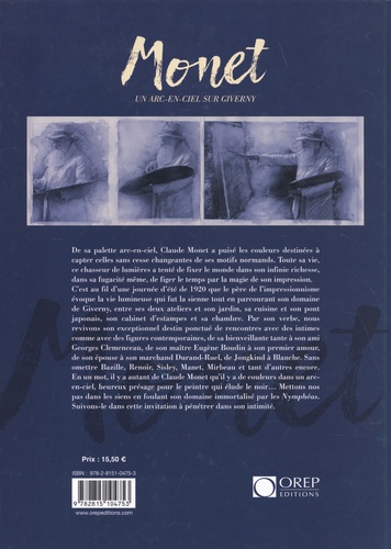 De sa palette arc-en-ciel, Claude Monet a puisé les couleurs destinées à capter celles sans cesse changeantes de ses motifs normands. Toute sa vie, ce chasseur de lumières a tenté de fixer le monde dans son infinie richesse, dans sa fugacité même, de figer le temps par la magie de son impression. C'est au fil d'une journée d'été de 1920 que le père de l'Impressionnisme évoque la vie lumineuse qui fut la sienne tout en parcourant son domaine de Giverny, entre ses deux ateliers et son jardin, sa cuisine et son pont japonais, son cabinet d'estampes et sa chambre. Par son verbe, nous revivons son exceptionnel destin ponctué de rencontres avec des intimes comme avec des figures contemporaines, de sa bienveillante tante à son ami Georges Clemenceau, de son maître Eugène Boudin à son premier amour, de son épouse à son marchand Durand-Ruel, de Jongking à Blanche. Sans omettre Bazille, Renoir, Sisley, Manet, Mirbeau et tant d'autres encore. En un mot, il y a autant de Claude Monet qu'il y a de couleurs dans un arc-en-ciel, heureux présage pour le peintre qui élude le noir... Mettons nos pas dans les siens en foulant son domaine immortalisé par les Nymphéas. Suivons-le dans cette invitation à pénétrer dans son intimité.