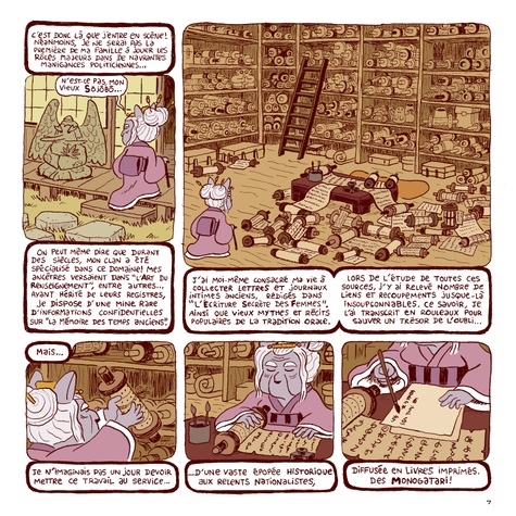 Monde sous le ciel, an 1155. L'empereur à peine âgé de 16 ans est frappé d'un mal étrange. A son décès les intrigues de palais se succèdent. Les clans s'inquiètent pour leurs privilèges. Chacun y va de son favori parmi les princes pouvant accéder au trône. Les courtisanes, les moines, toute la cour est en émoi. Voici une fresque sublime et brillante que l'auteur - Alexandre Akirakuma - nous livre dans un style graphique utilisant des personnages animaliers. Ce récit épique évoque l'histoire du Japon ancien, ses intrigues tant amoureuses que politiques. Non sans sensualité, il invite à s'y plonger avec raffinement et efficacité. Une découverte.