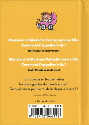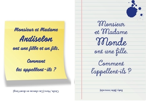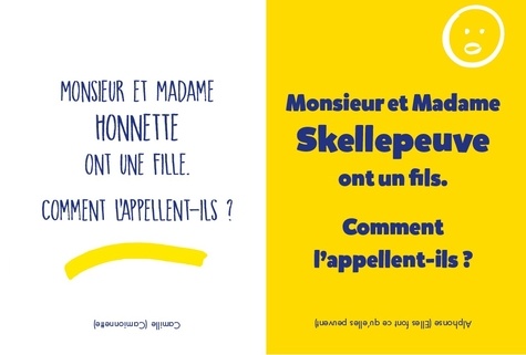 Le classique "Monsieur et Madame ont un fils. . ". revient en version cartonnée, avec ses meilleures vannes ! Monsieur et Madame Ailapoubelle ont un fils. Comment l'appellent-ils ? David Ailapoubelle (T'as vidé la poubelle ? ) Monsieur et Madame Noustété ont une fille. Comment l'appellent-ils ? Marion Noustété (Marions-nous cet été ! ) Monsieur et Madame Oukoi ont deux fils. Comment les appellent-ils ? Ted et Bill Oukoi (T'es débile ou quoi ? )