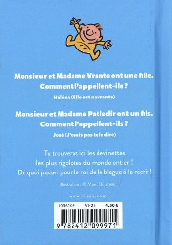 Monsieur et Madame Vrante ont une fille. Comment Rappellent-ils ? Méléna (Elle est navrante) Monsieur et Madame Patledir ont un fils. Comment l'appellent-ils ? José (J'osais pas te le dire) Tu trouveras ici les devinettes les plus rigolotes du monde entier ! De quoi passer pour le roi de la blague à la récré !