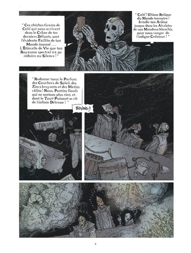 Succombant à une glissade sur une petite voiture oubliée par son fils dans sa salle de bains, Victor Tourterelle, cartographe, se retrouve de l'autre côté du miroir, n'ayant plus pour seule charpente que ses os, dans ce qui n'est autre que le "Purgatoire" banni des Ecritures. Dans cette prison du ciel, errent des squelettes rafistolés, trouvant dans les grains de café un lointain écho de la vie terrestre disparue et l'ivresse nécessaire pour affronter l'éternité aux confins de Pluton. Cornaqué par l'énigmatique facteur, aiguillonné par la Salamandre, entre les manoeuvres des psychopompes et celles de la milice, celui qui a été renommé Mardi-Gras Descendres va s'attaquer à ce qui n'avait jamais été fait auparavant : tracer les contours du monde dans lequel ils ont échoué, pour tenter d'en sortir.