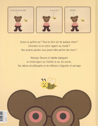 Qu'est-ce qu'être soi ? Peut-on être sûr de quelque chose ? Comment réagir face aux incertitudes et aux surprises qu'offre la vie ? Comment vit-on notre rapport au monde et aux autres ? Comment le langage et nos propres paroles nous jouent-ils parfois des tours ? Dans de courts échanges, sous forme de strips de 3 cases comme autant de petites bandes-dessinées, Monsieur Nourse et l'abeille s'interrogent, dialoguent, et se posent toutes sortes de questions sur l'amitié, l'existence, la vie le monde... Ils jouent avec la logique, les évidences, les certitudes et les incertitudes, et amènent le jeune lecteur à se familiariser avec les interrogations, la discussion et les mécanismes parfois subtils de la pensée.
