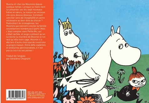 Mumla vit chez les Moomins depuis quelque temps. Lorsque sa mère vient lui présenter ses dix-sept nouveaux frères et soeurs, la maison se retrouve vite sens dessus dessous. Comment concilier sens de l'hospitalité et calme nécessaire au bien-être de chacun ? Redoublant de stratagèmes, les Moomins parviennent à inciter la famille nouvellement nombreuse à partir. Mais c'était compter sans Petite Mu, qui s'était cachée, et exige à présent qu'on lui donne la chambre de Moomin si l'on veut qu'elle reste sage. Moomin n'a dès lors d'autre choix que de construire sa propre maison. Entre défis matériels et embûches administratives, il n'est pas au bout de ses peines !