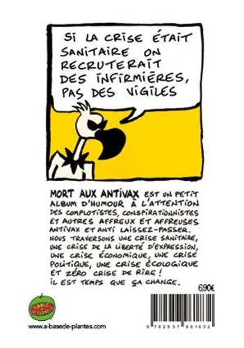 Mort aux Antivax est un petit album d'humour à l'attention des complotistes, conspirationnistes et autres affreux et affreuses antivax et anti-laissez-passer. Nous traversons une crise sanitaire, une crise de la liberté d'expression, une crise économique, une crise politique, une crise écologique et zéro crise de rire l Il était temps que ça change.