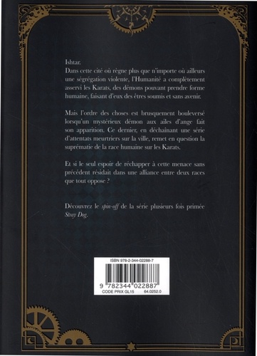 Humains ou karats ? Il est temps de choisir votre camp. Ishtar. Dans cette cité où règne plus que n'importe où ailleurs une ségrégation violente, l'Humanité a complètement asservi les Karats, des démons pouvant prendre forme humaine, faisant d'eux des êtres soumis et sans avenir. Mais l'ordre des choses est brusquement bouleversé lorsqu'un mystérieux démon aux ailes d'ange fait son apparition. Ce dernier, en déchaînant une série d'attentats meurtriers sur la ville, remet en question la suprématie de la race humaine sur les Karats. Et si le seul espoir de réchapper de cette menace sans précédent résidait dans une alliance entre deux races que tout oppose ? Série autonome qui se déploie dans l'univers foisonnant de VanRah, MortiCian est une satire de la société d'hier et d'aujourd'hui. L'asservissement des Karats y révèle ainsi le racisme, l'exclusion et la ségrégation sociales, tandis que l'histoire de ChiHiro n'est pas sans rappeler les attentats du 11 septembre et leurs conséquences. Si les démons sont bien présents ici, ils servent surtout à apporter une touche fantastique au récit, et à mettre en valeur la trouble ambiguïté d'Ishtar et de ses lois. Que vous soyez fan de Stray Dog ou désiriez découvrir l'univers de VanRah, Mortician vous tend les bras.