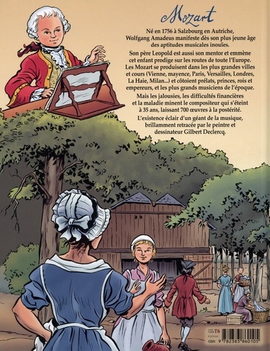Fils de musicien, Mozart naît en 1756 à Salzbourg. Il manifeste dès son plus jeune âge des aptitudes musicales inouïes. Son père, qui est aussi son mentor, emmène cet enfant prodige sur les routes de toute l'Europe, qu'il va éblouir par son génie. Munich, Vienne, Bratislava, Bruxelles, Paris, Londres, puis l'Italie. Les Mozart se produisent devant les plus grandes cours, côtoient princes, évêques, rois et empereurs. Mais les jalousies, les difficultés financières et les soucis de santé minent aussi l'existence du compositeur. Celui-ci s'éteint à 35 ans, laissant 700 oeuvres à la postérité. Cette BD raconte l'existence éclair, productive et éreintante, rocambolesque et charmante, d'un géant de la musique classique.