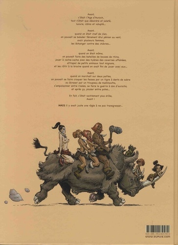 A la Préhistoire, quand on était chef de clan, on pouvait se balader à poil, avoir plusieurs femmes, les échanger contre des chèvres. A la Préhistoire, quand on était môme, on pouvait faire des batailles de bouses de rhino, vivre au milieu d'animaux tout mignons, les élever avec amour et les cuire à la broche pour les bouffer saignants. A la Préhistoire, quand on marchait sur deux pattes, on pouvait se faire dévorer par un tigre à dents de sabre, mourir écrasé par un troupeau de mammouths, s'empoisonner entre rivales, se faire la guerre à dos d'aurochs laineux... Yann et Lereculey nous offrent une tranche bien saignante de ces hommes pas franchement cro-mignons qui furent nos lointains ancêtres, et nous prouvent que l'humanité, c'était mammouthement mieux Avant.