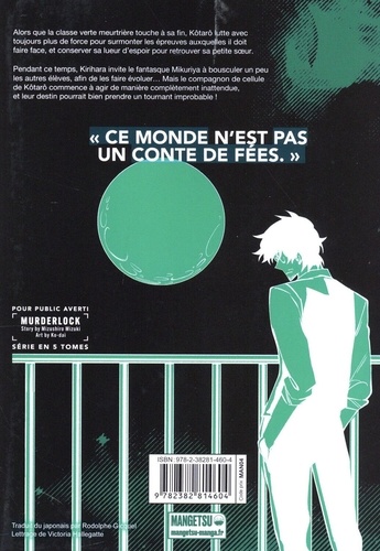 Alors que la classe verte meurtrière touche à sa fin, Kôtarô lutte avec toujours plus de force pour surmonter les épreuves auxquelles il doit faire face, et conserver sa lueur d'espoir pour retrouver sa petite soeur. Pendant ce temps, Kirihara invite le fantasque Mikuriya à bousculer un peu les autres élèves, afin de les faire évoluer... Mais le compagnon de cellule de K8tart5 commence à agir de manière complètement inattendue, j et leur destin pourrait bien prendre un toumant improbable !