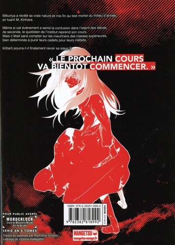 "Le prochain cours va bientôt commencer". Mikuriya a révélé sa vraie nature et mis fin au test mortel du milieu d'année, en tuant M. Kirihara. Même si cet événement a semé la confusion dans l'esprit des élèves de seconde, le quotidien de l'institut reprend son cours. Mais c'était sans compter sur les meurtriers des classes supérieures, bien déterminés à punir leurs cadets pour leurs méfaits. Kôtarô pourra-t-il finalement revoir sa soeur ? Découvrez le terrible institut de Kokuyô dans un survival captivant imaginé par le scénariste Mizuki Mizushiro et le dessinateur Ko-dai, qui nous offre des graphismes uniques dans cette série en 5 tomes.