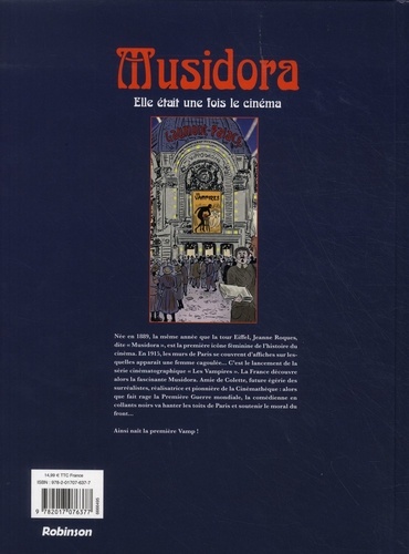 Née en 1889, la même année que la touur Eiffel, Jeanne Roques, dites "Musidora", est la première icône féminine de l'histoire du cinéma. En 1915, les murs de Paris se couvrent d'affiches sur lesquelles apparait une femme cagoulée... C'est le lancement de la série cinématographique "Les Vampires". La France découvre alors la fascinante Musidura. Amie de Colette, futur égérie des surréalistes, réalisatrice et pionnière de la Cinémathèque : alors que fait rage la Première Guerre mondiale, la comédienne en collants noirs va hanter les toits de Paris et soutenir le moral du front... Ainsi naît la première Vamp !