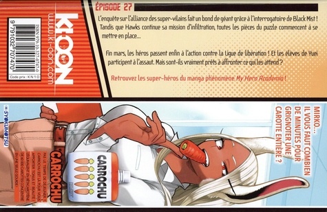 Retrouvez les super-héros du manga phénomène My Hero Academia ! Le combat fait rage entre les membres de l'Alliance et le Front de libération... Prêt à tout pour sauver ses amis, Twice libère son pouvoir et parvient à se démultiplier à l'infini ! La voie est libre pour Tomura, qui se retrouve face au président de Detnerat, Re-Destro... Au cours de l'affrontement, d'étranges souvenirs refont surface dans l'esprit de l'héritier d'All for One. Arrivera-t-il enfin à accepter son passé et à prouver sa valeur ? Retrouvez les super-héros du manga phénomène My Hero Academia !