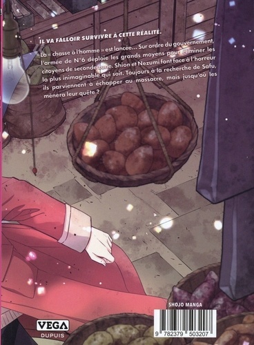 Il va falloir survivre a cette réalité. La "chasse à l'homme" est lancée... Sur ordre du gouvernement, l'armée de N°6 déploie les grands moyens pour éliminer les citoyens de seconde zone. Shion et Nezumi font face à l'horreur la plus inimaginable qui soit. Toujours à la recherche Safu, ils parviennent à échapper au massacre, mais jusqu'où mènera leur quête ?