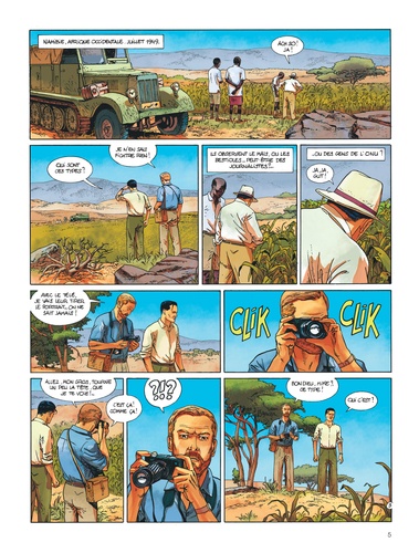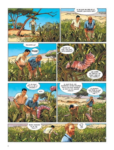 1948, Göring, Reichmarschall de triste mémoire de la seconde guerre mondiale, aurait été aperçu en Namibie bien qu'il soit officiellement... mort ! A peine revenue de sa mission au Kenya, Cathy Austin est dès lors renvoyée en Afrique par le MI6. Elle découvre sur place une menace extraterrestre qui fait froid dans le dos : une race d'aliens prélève en effet de l'ADN sur des cadavres humains pour reconstituer et occuper ces corps. Ces éclaireurs discrets (sauf lorsqu'ils redonnent vie au corps de Göring ! ) élèvent dans les champs namibiens des insectes qu'ils ont également génétiquement modifié en vue d'en faire une arme de colonisation massive ! Il s'agit là du premier tome de la deuxième saison de Kenya dessiné par Bertrand Marchal qui reprend le style de Leo à la perfection.
