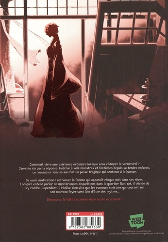Comment vivre une existence ordinaire lorsque vous côtoyez le surnaturel ? Jae-shin n'a pas la réponse. Habitué à voir monstres et fantômes depuis sa tendre enfance, ce romancier sans-le-sou fuit un passé tragique qui continue à le hanter. Sa seule motivation : retrouver la femme qui apparaît chaque nuit dans ses rêves. Lorsqu'il entend parler de mystérieuses disparitions dans le quartier Nan Yak, il décide de s'y rendre. Cependant, il réalise bien vite que les rumeurs sinistres qui courent sur son nouveau foyer sont loin d'être des mythes... Découvrez le folklore coréen dans toute sa cruauté !