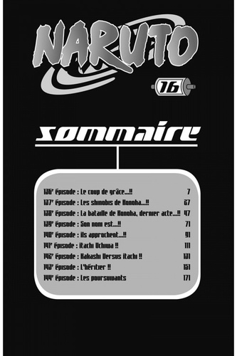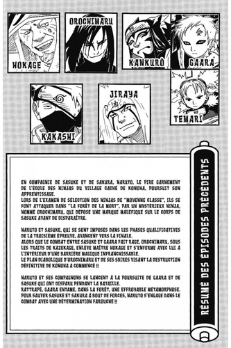 Pour sauver ceux qu'il aime, Naruto, en très mauvaise posture, porte une attaque dévastatrice à Gaara !! Après avoir atteint des sommets de violence, le combat à mort entre Orochimaru et Hokage arrive à son dénouement !! Alors que l'assaut sur Konoha se termine, deux sinistres personnages s'approchent du village de nos compagnons...