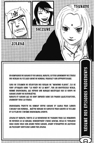 Les édifices de Tanzaku tremblent !! Tsunade devient d'emblée très agressive lorsque Orochimaru apparaît devant elle ! Son ancien camarade lui propose un pacte maléfique, afin qu'elle lui rende l'usage de ses bras. C'est une Tsunade en proie à la confusion que Jiraya et Naruto vont trouver !! Quel sera le choix de Tsunade ?