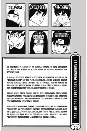Naruto et ses compagnons forcent l'entrée du repaire d'Akatsuki pour se trouver face à un Gaara méconnaissable aux mains de ses geôliers ! Débordant de rage, Naruto se rue sur Deidara, qui parvient malgré tout à s'échapper. Sakura et la vieille Chiyo se retrouvent alors seules dans la grotte face au redoutable Sasori. Parviendront-elles à lui barrer la route ?