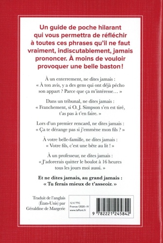 Un guide de poche hilarant qui vous permettra de réfléchir à toutes ces phrases qu'il ne faut vraiment, indiscutablement, jamais prononcer. A moins de vouloir provoquer une belle baston ! A un enterrement, ne dites jamais : " A ton avis, y a des gens qui ont déjà pécho son appart ? Parce que ça m'intéresse... " Dans un tribunal, ne dites jamais : " Franchement, si O. J. Simpson s'en est tiré, t'as pas à t'en faire. " Lors d'un premier rencard, ne dites jamais : " Ca te dérange pas si j'emmène mon fils ? " A votre belle-famille, ne dites jamais : " Votre fils, c'est une bête au lit ! " A un professeur, ne dites jamais : " J'adorerais quitter le boulot à 16 heures tous les jours moi aussi. " Et ne dites jamais, au grand jamais : " Tu ferais mieux de t'asseoir. "