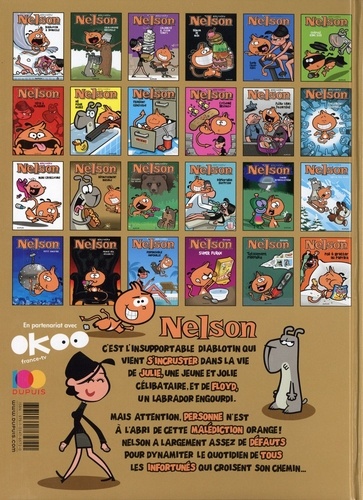 Nelson, c'est l'insupportable diablotin qui vient s'incruster dans la vie de Julie, une jeune et jolie célibataire, et de Floyd, un labrador engourdi. Mais attention, personne n'est à l'abri de cette malédiction orange ! Nelson a largement assez de défauts pour dynamiter le quotidien de tous les infortunés qui croisent son chemin...
