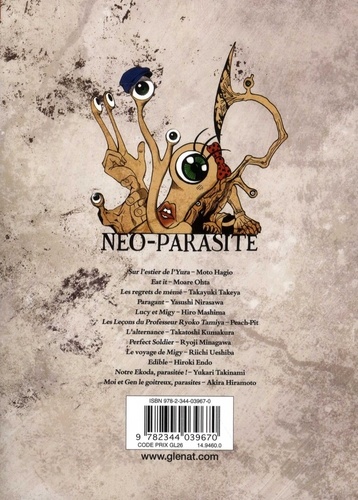 Douze grands auteurs se sont rassemblés pour créer cette anthologie officielle autour de l'oeuvre culte Parasite. Suite, spin-off, mélange d'univers, aspects non évoqués dans le manga... Chaque auteur a rendu hommage au manga de Iwaaki à sa façon : réflexion sur l'humanité par Moto Hagio, combats militaires par Ryoji Minagawa, parodie érotique par Akira Hiramoto (Prison School), ou improbable fusion de Lucy et Miggy par Hiro Mashima (Fairy Tail)... L'univers de Parasite est décidément un très bon point de départ pour développer son imagination !