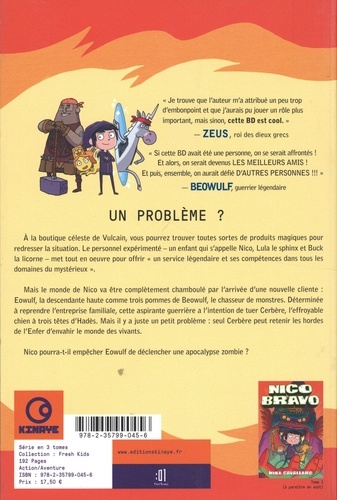 "Je trouve que l'auteur m'a attribué un peu trop d'embonpoint et que j'aurais pu jouer un rôle plus important, mais sinon, cette BD est cool." - Zeus, roi des dieux grecs. "Si cette BD avait été une personne, on se serait affrontés ! Et alors, on serait devenus les meilleurs amis ! Et puis, ensemble, on aurait défié d'autres personnes !!! " - Beowulf guerrier légendaire. Un problème ? A la boutique céleste de Vulcain, vous pourrez trouver toutes sortes de produits magiques pour redresser la situation. Le personnel expérimenté — un enfant qui s'appelle Nico, Lula le sphinx et Buck la licorne — met tout en oeuvre pour offrir "un service légendaire et ses compétences dans tous les domaines du mystérieux". Mais le monde de Nico va être complètement chamboulé par l'arrivée d'une nouvelle cliente : Eowulf, la descendante haute comme trois pommes de Beowulf, le chasseur de monstres. Déterminée à reprendre l'entreprise familiale, cette aspirante guerrière a l'intention de tuer Cerbère, l'effroyable chien à trois têtes d'Hadès. Mais il y a juste un petit problème : seul Cerbère peut retenir les hordes de l'Enfer d'envahir le monde des vivants. Nico pourra-t-il empêcher Eowulf de déclencher une apocalypse zombie ?