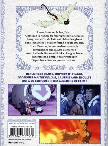 L'eau, la terre, le feu, l'air... Alors que la nation du feu règne par la terreur, Aang, jeune fils de l'air, est libéré des glaces dans lesquelles il était enfermé depuis 100 ans. Il est l'Avatar, le seul maitre à pouvoir commander aux quatre éléments ! Avec l'aide de Katara et Sokka, Aang se lance dans un long périple pour restaurer l'équilibre entre les quatre nations... Replongez dans l'univers d'Avatar, le dernier maître de l'air, la série animée culte qui a su conquérir des millions de fans !