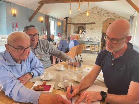 Hier is een foto van de heer Hébras die de schetsen van Bruno Marivain corrigeert. Tijdens een bezoek aan de ruïnes in zijn gezelschap, in mei 2022, maakte de tekenaar verschillende schetsen van de Laudy-schuur, waar de mannen van het dorp op 10 juni 1944 door de soldaten van Das Reich werden neergeschoten en verbrand.