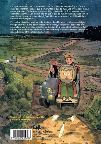 Lorsque le dernier bus ou le dernier train de la journée est passé, pas d'autre choix pour rentrer chez soi que d'emprunter le bus de nuit. Les arrêts sont moins nombreux mais d'autant plus propices à la conversation et à la découverte de quartiers inconnus. Car il n'est pas dit que le bus de nuit nous conduira là où l'on souhaite se rendre de prime abord. Peut-être même marquera-t-il l'arrêt dans des contrées imaginaires... Entre rêve et réalité, familier et fantastique, Zuo Ma nous convie à un sublime voyage empreint d'une douce magie où émotions, souvenirs et désirs tes plus profonds ressurgissent de manière inattendue. Et si la destination finale se fait désirer, les arrêts intermédiaires ne manqueront pas de nous révéler ce que l'on ignorait même être en train de chercher.