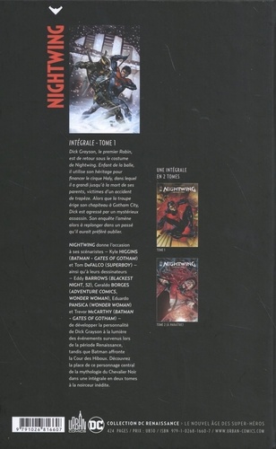 Dick Grayson, le premier Robin, est de retour sous le costume de Nightwing. Enfant de la balle, il utilise son héritage pour financer le cirque Haly, dans lequel il a grandi jusqu'à la mort de ses parents, victimes d'un accident de trapèze. Alors que la troupe érige son chapiteau à Gotham City, Dick est agressé par un mystérieux assassin. Son enquête l'amène alors à replonger dans un passé qu'il aurait préféré oublier. Nightwing donne l'occasion à ses scénaristes - Kyle Higgins (Batman - Gates of Gotham) et Tom DeFalco (Superboy) - ainsi qu'à leurs dessinateurs — Eddy Barrows (BLACKEST Night, 52), Geraldo Borges (Adventure Comics, Wonder Woman), Eduardo Pansica (Wonder Woman) et Trevor McCarthy (Batman - Gates of Gotham) - de développer la personnalité de Dick Grayson à la lumière des événements survenus lors de la période Renaissance, tandis que Batman affronte la Cour des Hiboux. Découvrez la place de ce personnage central de la mythologie du Chevalier Noir dans une intégrale en deux tomes à la noirceur inédite.