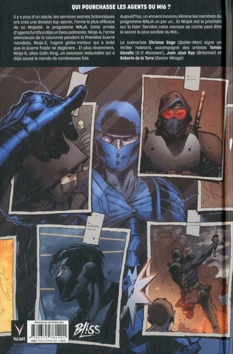 Il y a plus d'un siècle, les services secrets britanniques ont créé une division top-secret, l'arme la plus efficace de sa Majesté : le programme NINJA. Cette armée d'agents furtifs a déjà un beau palmarès : Ninja-A, l'arme silencieuse de la couronne pendant la Première Guerre mondiale, Ninja-E, l'agent globe-trotteur qui a évité que la Guerre froide ne dégénère... Et plus récemment, Ninja-K, alias Colin King, un assassin redoutable qui a déjà sauvé le monde de nombreuses fois. Aujourd'hui, un ennemi inconnu élimine les membres du programme Ninja un par un... Et Ninjak est le prochain sur la liste ! Derrière cette menace se cache peut-être le secret le plus sordide du MI6... Le scénariste Christos Gage (Spider-Man) signe un thriller haletant, accompagné des artistes Tomas Giorello (X-O Manowar), Juan José Ryp (Britannia) et Roberto de la Torre (Doctor Mirage).