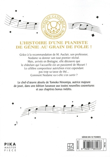 L'histoire d'une pianiste de génie au grain de folie ! Grâce à la recommandation de M. Auclair, son professeur, Nodame va donner son tout premier récital. Mais, arrivée en Bretagne, elle découvre que le châtelain qui l'accueille est un passionné de Mozart ! Le célèbre compositeur autrichien n'est cependant pas trop sa tasse de thé... Comment Nodame va-t-elle s'en sortir ? Le chef-d'oeuvre absolu de Tomoko Ninomiya, autrice majeure de josei, dans une édition luxueuse aux toutes nouvelles couvertures et aux chapitres bonus inédits.