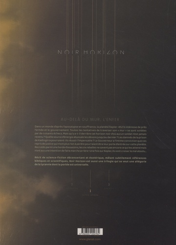 Au-delà du mur, l'Enfer. Dans un monde post-apocalyptique en souffrance, la planète Kepler-452 b intéresse de près l'armée. Toutes les tentatives de traverser son " mur " se sont soldées par de cuisants échecs. Mais qu'y a-t-il derrière cet écran noir d'où aucun des soldats n'est jamais revenu ? Quelle source d'énergie abyssale les dévore jusqu'au dernier ? Face à ce noir horizon, les sondes et les androïdes tombent en panne, les caméras se brouillent. Les damnés de la prison de Kadingirra pourraient-ils réussir l'impensable ? Le Gouverneur a l'intime conviction que ces repris de justice qui n'ont plus rien à perdre pourraient être leur porte d'entrée sur cette planète. Recrutés parmi une horde d'assassins, les six rebelles ne savent pas encore ce qui les attend mais n'ont aucune intention de faire marche arrière ! Une fois sur Kepler, ils vont croiser le mal absolu... car le brouillard transforme les hommes en ce qu'ils ont de plus sombre. Pour ces six criminels ou six prophètes, c'est le début d'une expédition en Enfer. A moins que ce ne soit le début d'une mission d'envergure pour l'Humanité... Philippe Pelaez et Benjamin Blasco-Martinez nous réservent un récit SF déconcertant et ésotérique mêlant subtilement références bibliques et scientifiques. Premier tome d'une trilogie qui se veut une allégorie de la tyrannie, Noir Horizon interroge le lecteur : qu'est-ce qui permet à un nombre restreint d'individus d'imposer leur volonté ? Comment l'homme en arrive-t-il à se soumettre de plein gré ? Avec une forte approche cinématographique, le duo signe un album qui détonne, à l'ambiance incandescente avec une forte portée universelle.