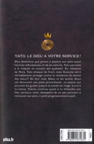 Plus déterminé que jamais à abattre son père avant l'arrivée d'Amaterasu et de sa cohorte, Yato parvient à le traquer en suivant ses ayakashi. En l'absence de Nora, Yato attaque de front, mais Kazuma est-il véritablement protégé contre la révélation du secret des dieux ? De leur côté, Ebisu et les autres dieux ont découvert une piste prometteuse : un poème qui pourrait les guider jusqu'à la tombe du mage. Livré à lui-même, Yukine continue quantà lui d'étendre son filet vertueux mais, désespéré de ne pas parvenir à retrouver son père, il perd progressivement pied...